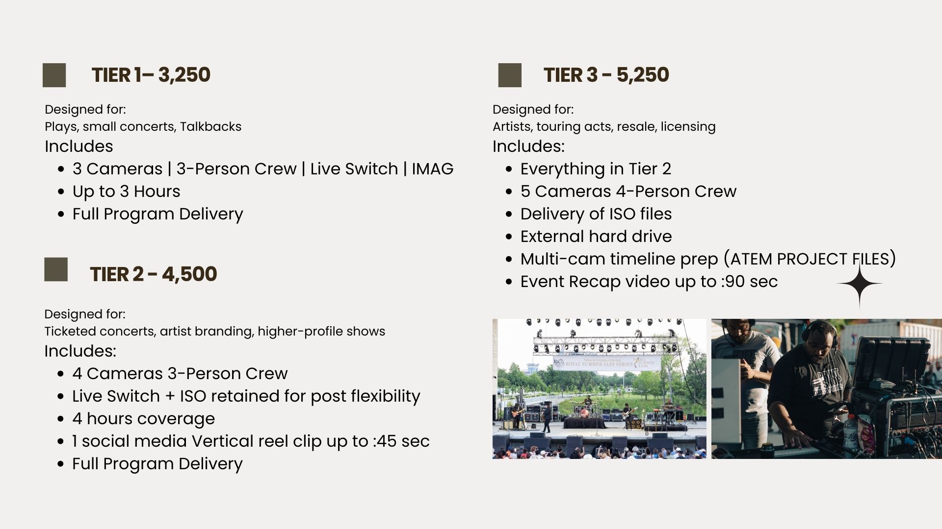 • 3 Cameras | 3-person Crew | Live Switch IMAG